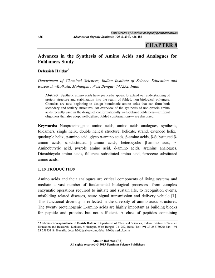 Advances in the Synthesis of Amino Acids and Analogues for Foldamers Study, Page 1 of 1