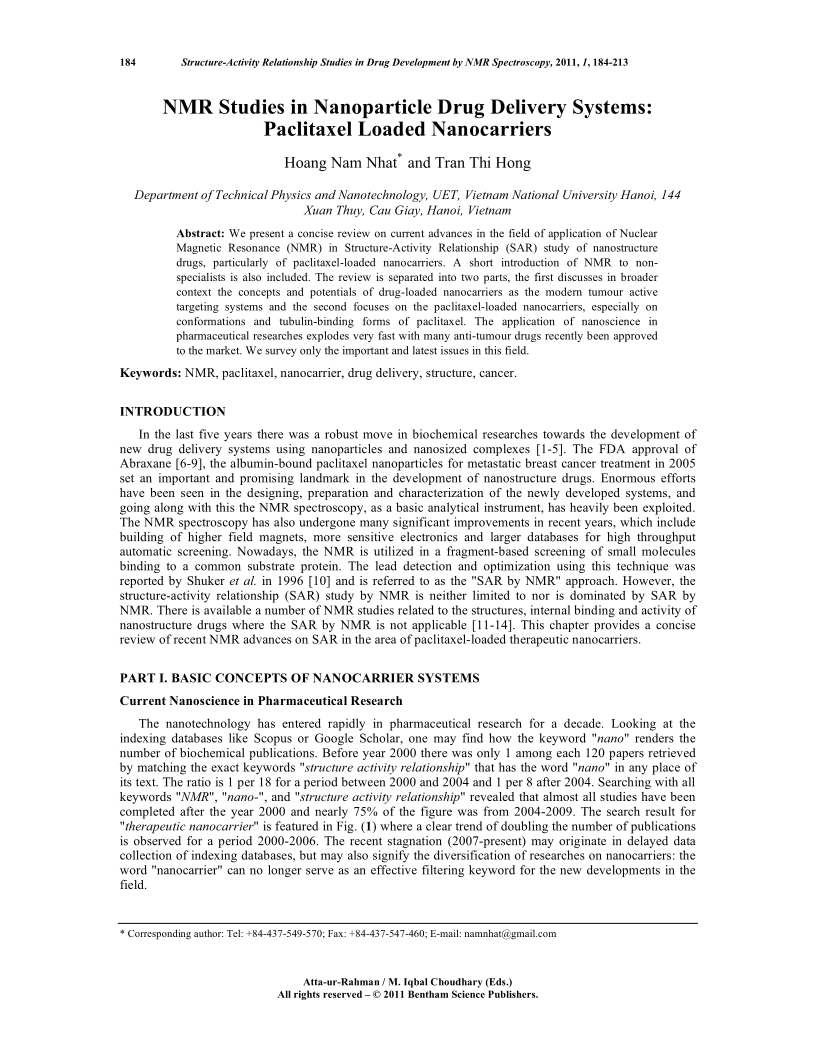 NMR Studies in Nanoparticle Drug Delivery Systems: Paclitaxel Loaded Nanocarriers, Page 1 of 1
