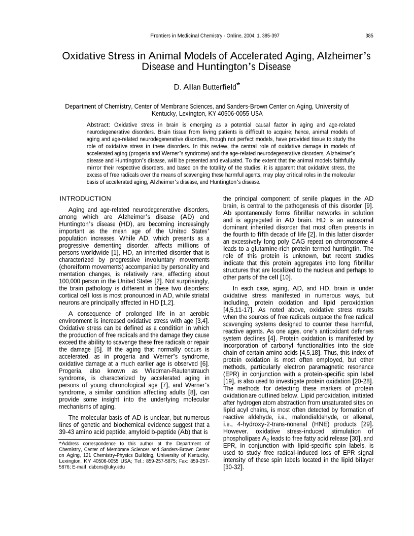 Oxidative Stress in Animal Models of Accelerated Aging, Alzheimers Disease and Huntingtons Disease, Page 1 of 1