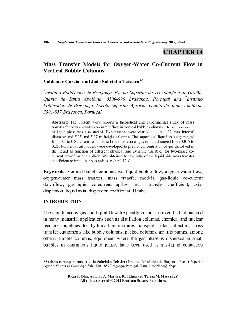 Mass Transfer Models for Oxygen-Water Co-Current Flow in Vertical Bubble Columns, Page 1 of 1