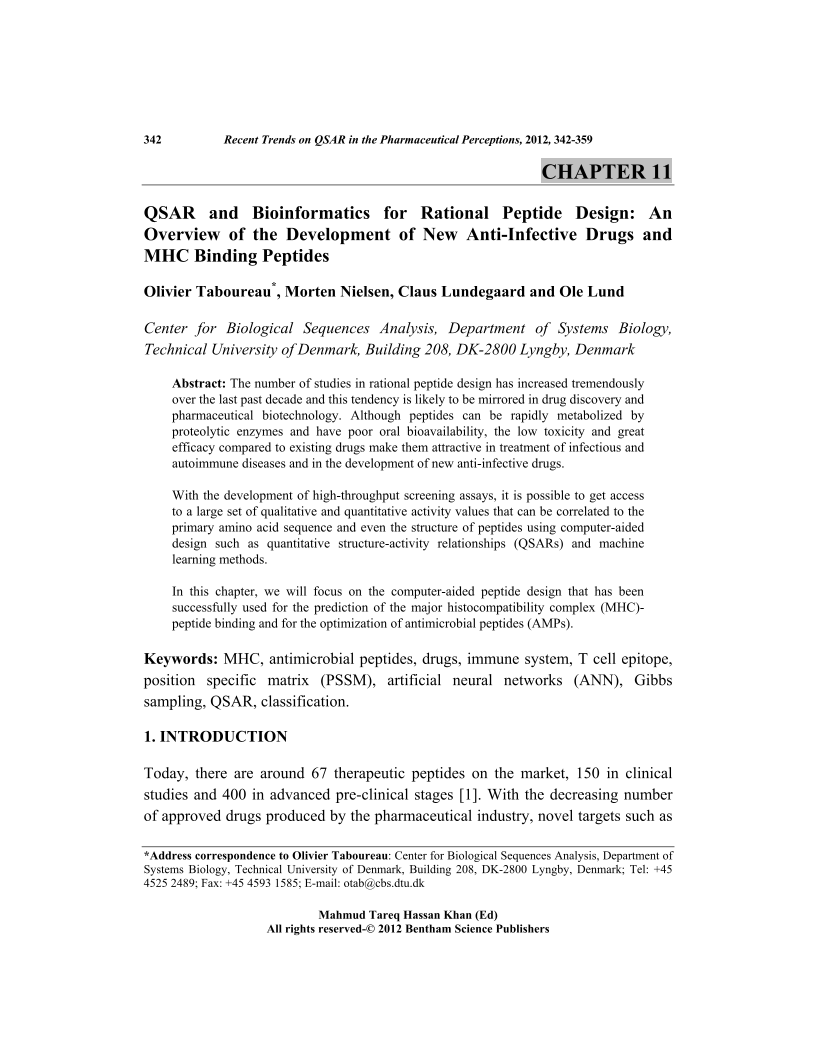 QSAR and Bioinformatics for Rational Peptide Design: An Overview of the Development of New Anti-Infective Drugs and MHC Binding Peptides, Page 1 of 1