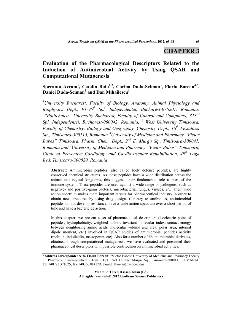 Antimicrobial peptides, also called body defense peptides, are highly conserved chemical structures. As these peptides have a wide distribution across the animal and vegetal kingdoms, this suggests their fundamental role as part of the immune system. These peptides are used against a wide range of pathogens, such as negative- and positive-gram bacteria, microbacteria, fungus, viruses, etc. Their wide action spectrum makes them important targets for pharmaceutical industry in order to obtain new structures by using drug design. Contrary to antibiotics, antimicrobial peptides do not develop resistance, have a wide action spectrum over a short period of time and have a bactericide action. </p><p> In this chapter, we present a set of pharmaceutical descriptors (isoelectric point of peptides, hydrophobicity, weighted holistic invariant molecular index, contact energy between neighboring amino acids, molecular volume and area, polar area, internal dipole moment, etc.) involved in QSAR studies of antimicrobial peptides activity (melittin, indolicidin, mastoporan, etc). Also for a number of 66 antimicrobial derivates, obtained through computational mutagenesis, we have evaluated and presented their pharmaceutical descriptors with possible contribution on antimicrobial activities.