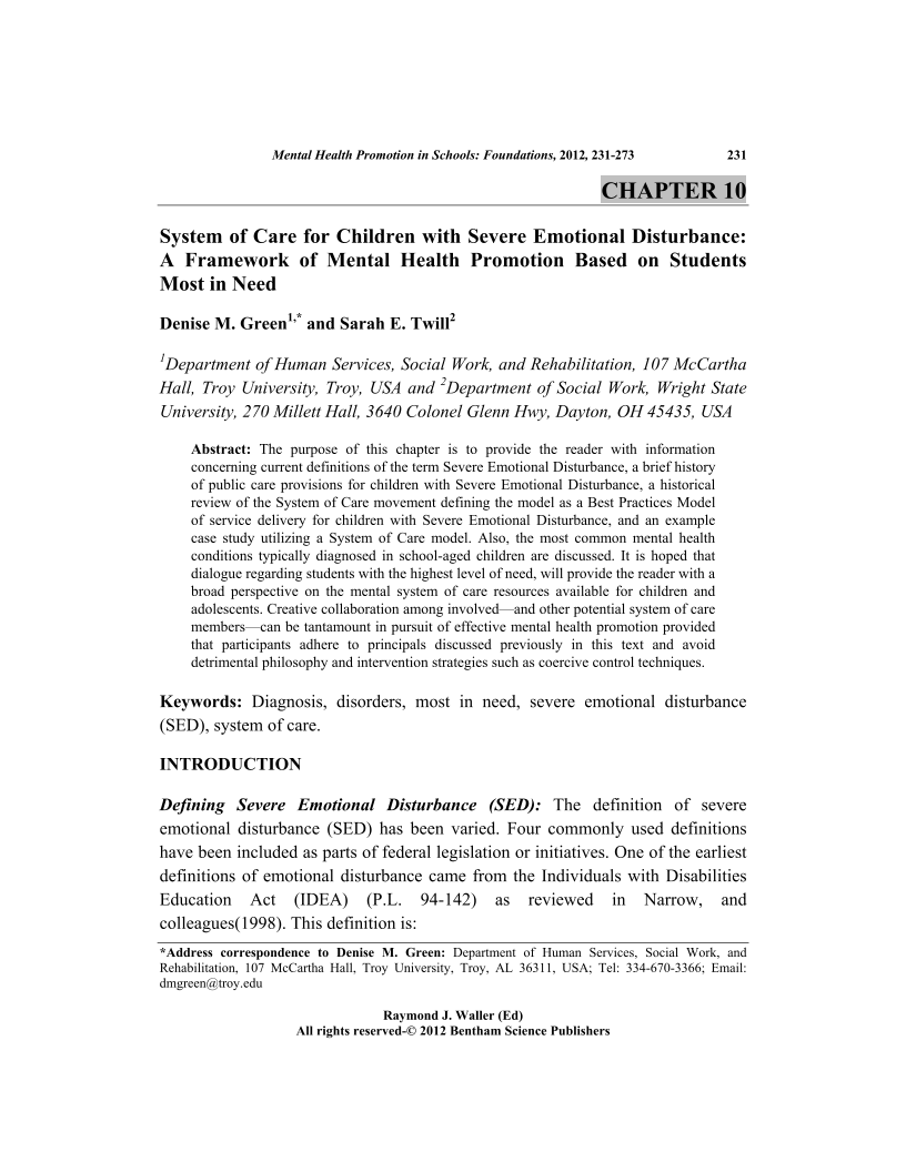 The purpose of this chapter is to provide the reader with information concerning current definitions of the term Severe Emotional Disturbance, a brief history of public care provisions for children with Severe Emotional Disturbance, a historical review of the System of Care movement defining the model as a Best Practices Model of service delivery for children with Severe Emotional Disturbance, and an example case study utilizing a System of Care model. Also, the most common mental health conditions typically diagnosed in school-aged children are discussed. It is hoped that dialogue regarding students with the highest level of need, will provide the reader with a broad perspective on the mental system of care resources available for children and adolescents. Creative collaboration among involvedand other potential system of care memberscan be tantamount in pursuit of effective mental health promotion provided that participants adhere to principals discussed previously in this text and avoid detrimental philosophy and intervention strategies such as coercive control techniques.