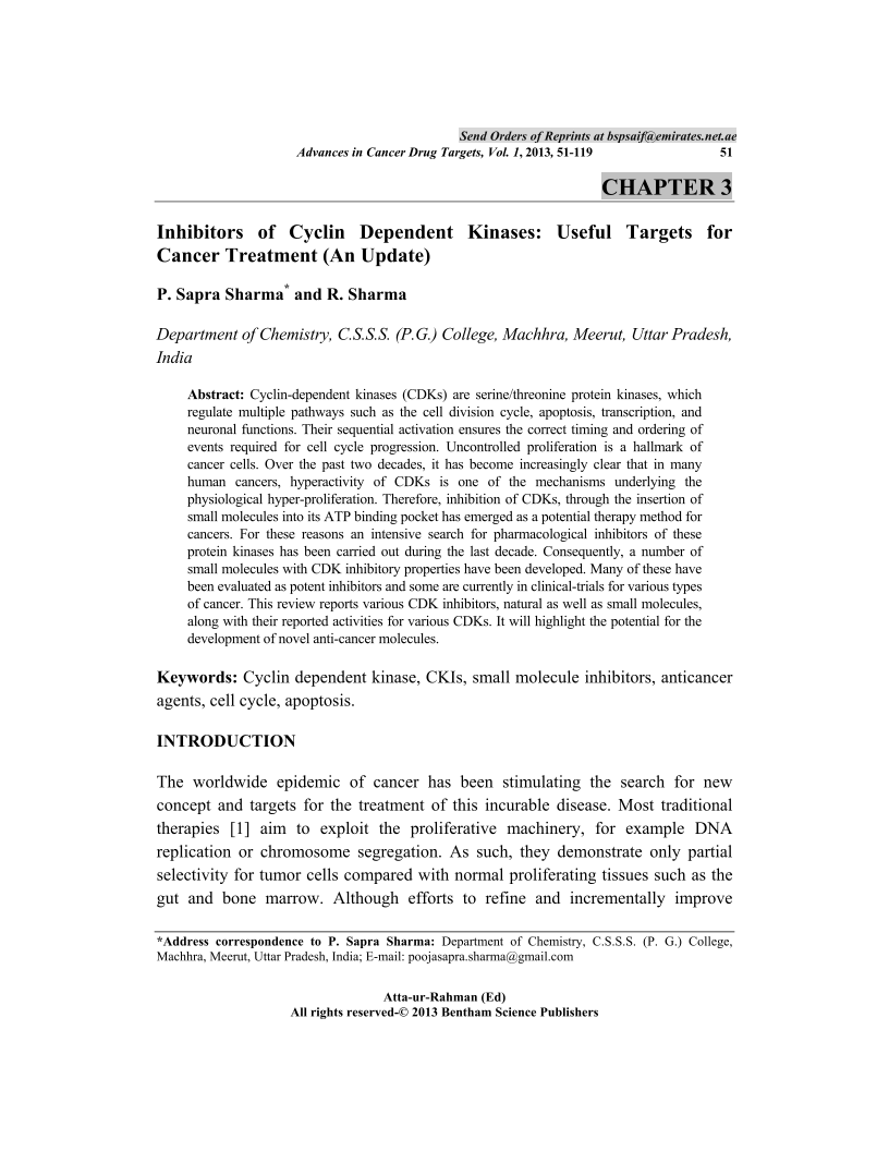 Inhibitors of Cyclin Dependent Kinases: Useful Targets for Cancer Treatment (An Update), Page 1 of 1