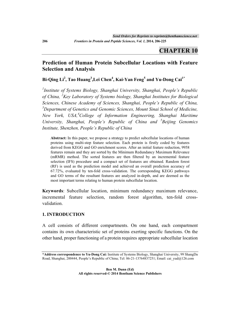 Prediction of Human Protein Subcellular Locations with Feature Selection and Analysis, Page 1 of 1