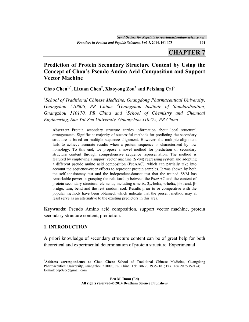 Prediction of Protein Secondary Structure Content by Using the Concept of Chous Pseudo Amino Acid Composition and Support Vector Machine, Page 1 of 1