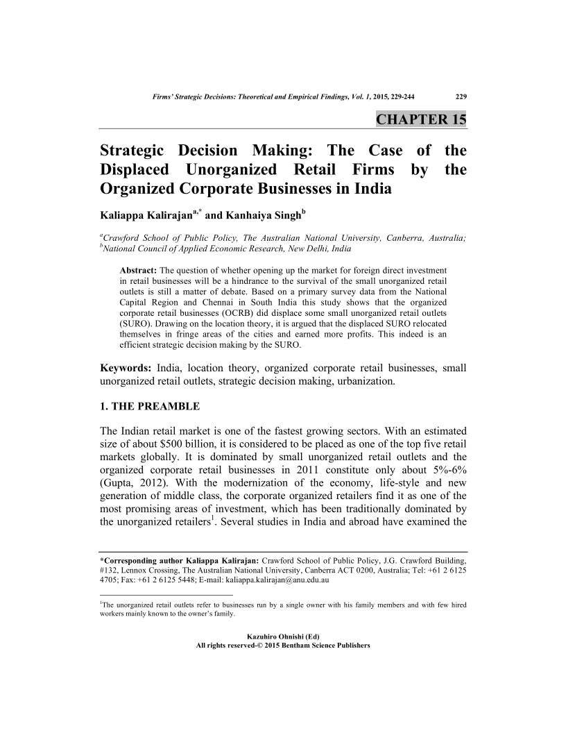 Strategic Decision Making: The Case of the Displaced Unorganized Retail Firms by the Organized Corporate Businesses in India, Page 1 of 1
