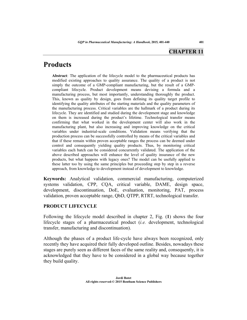 The application of the lifecycle model to the pharmaceutical products has modified existing approaches to quality assurance. The quality of a product is not simply the outcome of a GMP-compliant manufacturing, but the result of a GMPcompliant lifecycle. Product development means devising a formula and a manufacturing process, but most importantly, understanding thoroughly the product. This, known as quality by design, goes from defining its quality target profile to identifying the quality attributes of the starting materials and the quality parameters of the manufacturing process. Critical variables are the hallmark of a product during its lifecycle. They are identified and studied during the development stage and knowledge on them is increased during the products lifetime. Technological transfer means confirming that what worked in the development center will also work in the manufacturing plant, but also increasing and improving knowledge on the critical variables under industrial-scale conditions. Validation means verifying that the production process can be successfully controlled by means of the critical variables and that if these remain within proven acceptable ranges the process can be deemed under control and consequently yielding quality products. Thus, by monitoring critical variables each batch can be considered concurrently validated. The application of the above described approaches will enhance the level of quality insurance of the new products, but what happens with legacy ones? The model can be usefully applied to these latter too by using the same principles but proceeding step by step in a reverse approach, from knowledge to development instead of development to knowledge.