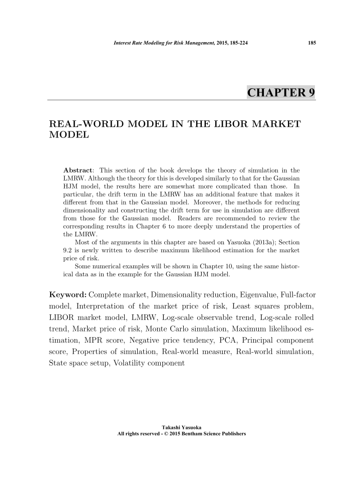 This section of the book develops the theory of simulation in the LMRW. Although the theory for this is developed similarly to that for the Gaussian HJM model, the results here are somewhat more complicated than those. In particular, the drift term in the LMRW has an additional feature that makes it different from that in the Gaussian model. Moreover, the methods for reducing dimensionality and constructing the drift term for use in simulation are different from those for the Gaussian model. Readers are recommended to review the corresponding results in Chapter 6 to more deeply understand the properties of the LMRW. Most of the arguments in this chapter are based on Yasuoka (2013a); Section 9.2 is newly written to describe maximum likelihood estimation for the market price of risk. Some numerical examples will be shown in Chapter 10, using the same historical data as in the example for the Gaussian HJM model.