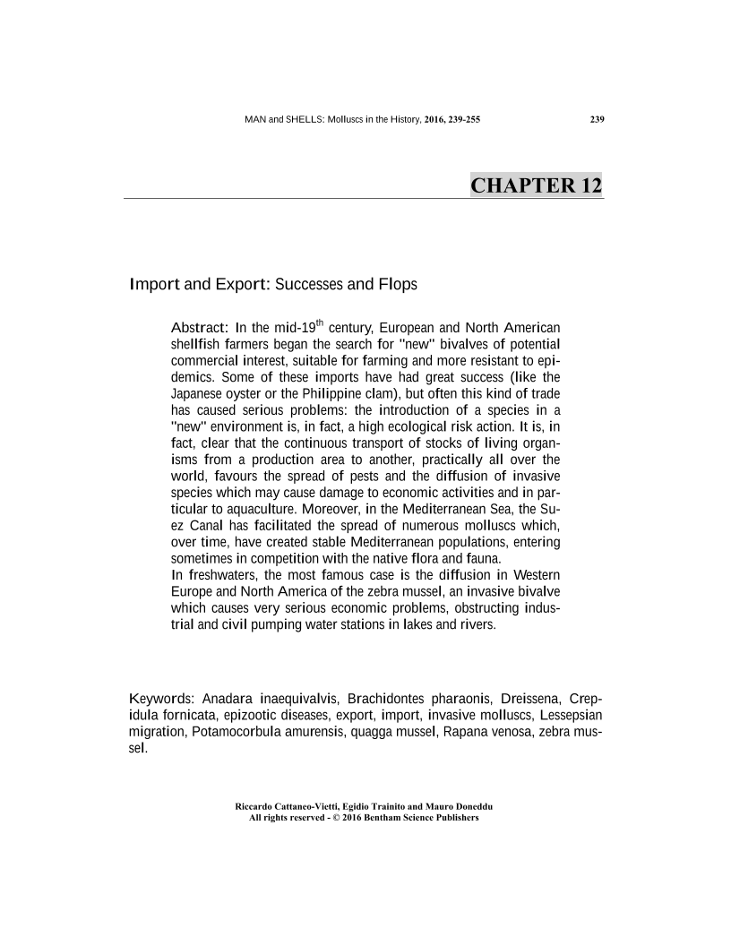 In the mid-19thcentury, European and North American shellfish farmers began the search for "new" bivalves of potential commercial interest, suitable for farming and more resistant to epi-demics. Some of these imports have had great success (like the Japanese oyster or the Philippine clam), but often this kind of trade has caused serious problems: the introduction of a species in a "new" environment is, in fact, a high ecological risk action. It is, in fact, clear that the continuous transport of stocks of living organ-isms from a production area to another, practically all over the world, favours the spread of pests and the diffusion of invasive species which may cause damage to economic activities and in par-ticular to aquaculture. Moreover, in the Mediterranean Sea, the Su-ez Canal has facilitated the spread of numerous molluscs which, over time, have created stable Mediterranean populations, entering sometimes in competition with the native flora and fauna. </p> <p> In freshwaters, the most famous case is the diffusion in Western Europe and North America of the zebra mussel, an invasive bivalve which causes very serious economic problems, obstructing indus-trial and civil pumping water stations in lakes and rivers.