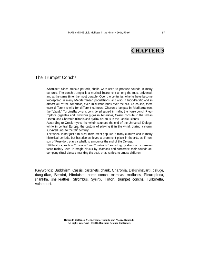 Since archaic periods, shells were used to produce sounds in many cultures. The conch-trumpet is a musical instrument among the most universal, and at the same time, the most durable. Over the centuries, whelks have become widespread in many Mediterranean populations, andalso in Indo-Pacific and in almost all of the Americas, even in distant lands over the sea. Of course, there were different shells for different cultures: Charonia lampasin Mediterranean, the "chank" Turbinella pyrum,considered sacred inIndia, the horse conch Pleu-roploca giganteaand Strombus gigasin Americas, Cassis cornutain the Indian Ocean, and Charonia tritonisand Syrinx aruanusin the Pacific Islands. </p> <p> According to Greek myths, the whelk sounded the end of the Universal Deluge, while in central Europe, the custom of playing it in the wind, during a storm, survived until to the 20th century. </p> <p> The whelk is not just a musical instrument popular in many cultures and in many historical periods, but has also achieved a prominent place in the arts, as Triton, son of Poseidon, plays a whelk to announce the end of the Deluge. </p> <p> Shell-rattles, such as "maracas" and "castanets" sounding by shack or percussion, were mainly used in magic rituals by shamans and sorcerers: their sounds ac-company ritual dances, marking the beat, or as rattles, to amuse children.