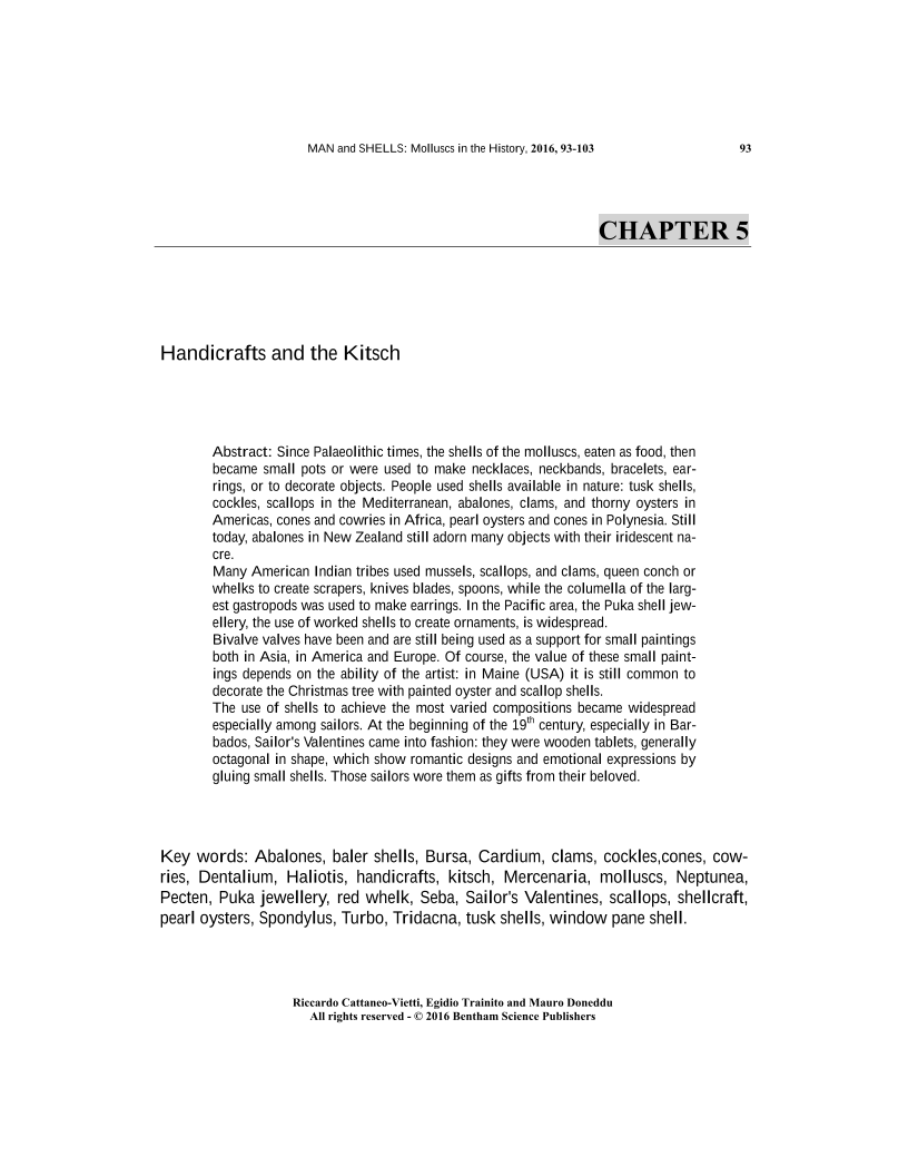 Since Palaeolithic times, the shells of the molluscs, eaten as food, then became small pots or were used to make necklaces, neckbands, bracelets, ear-rings, or to decorate objects. People used shells available in nature: tusk shells, cockles, scallops in the Mediterranean, abalones, clams, and thorny oysters in Americas, cones and cowries in Africa, pearl oysters and cones in Polynesia. Still today, abalones in New Zealand still adorn many objects with their iridescent na-cre. </p> <p> Many American Indian tribes used mussels, scallops, and clams, queen conch or whelks to create scrapers, knives blades, spoons, while the columellaof the larg-est gastropods was used to make earrings. In the Pacific area, the Puka shell jew-ellery, the use of worked shells to create ornaments, is widespread. </p> <p> Bivalve valves have been and are still being used as a support for small paintings both in Asia, in America and Europe. Of course, the value of these small paint-ings depends on the ability of the artist: in Maine (USA) it is still common to decorate the Christmas tree with painted oyster and scallop shells. </p> <p> The use of shells to achieve the most varied compositions became widespread especially among sailors. At the beginning of the 19thcentury, especially in Bar-bados, Sailor's Valentinescame into fashion: they were wooden tablets, generally octagonal in shape, which show romantic designs and emotional expressions by gluing small shells. Those sailors wore them as gifts from their beloved.