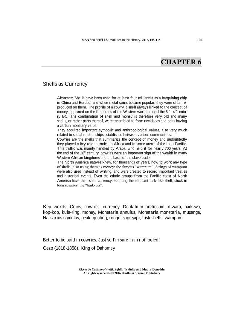 Shells have been used for at leastfour millennia as a bargaining chip in China and Europe, and when metal coins became popular, they were often re-produced on them. The profile of a cowry, a shell always linked to the concept of money, appeared on the first coins of the Western world around the 5th -4th centu-ry BC. The combination of shell and money is therefore very old and many shells, or rather parts thereof, were assembled to form necklaces and belts having a certain monetary value. </p> <p> They acquired important symbolic and anthropological values, also very much related to social relationships established between various communities. </p> <p> Cowries are the shells that summarize the concept of money and undoubtedly they played a key role in trades in Africa and in some areas of the Indo-Pacific. This traffic was mainly handled by Arabs, who held it for nearly 700 years. At the end of the 16th century, cowries were an important sign of the wealth in many Western African kingdoms and the basis of the slave trade. </p> <p> The North America natives knew, for thousands of years, how to work any type of shells, also using them as money: the famous "wampum". Strings of wampum were also used instead of writing, and were created to record important treaties and historical events. Even the ethnic groups from the Pacific coast of North America have their shell currency, adopting the elephant tusk-like shell, stuck in long rosaries, the "haik-wa".