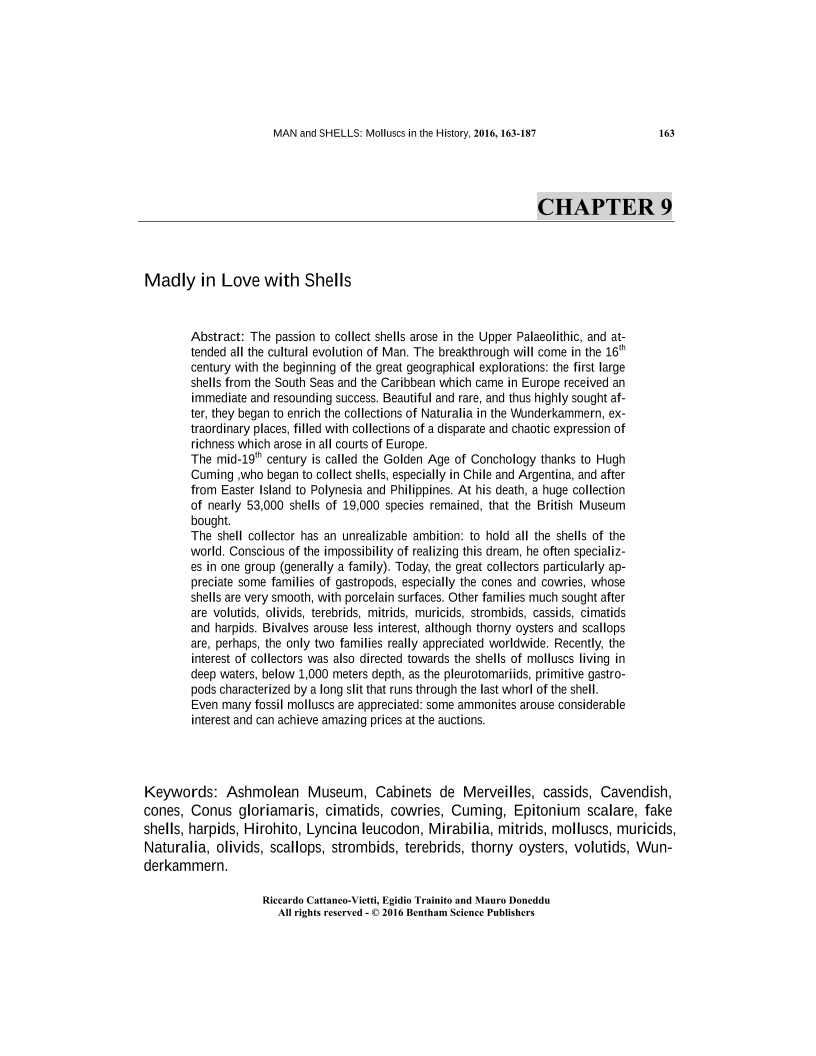 The passion to collect shells arose in the Upper Palaeolithic, and at-tended all the cultural evolution of Man. The breakthrough will come in the 16th century with the beginning of the great geographical explorations: the first large shells from the South Seas and the Caribbean which came in Europe received an immediate and resounding success. Beautiful and rare, and thus highly sought af-ter, they began to enrich the collections of Naturaliain the Wunderkammern,ex-traordinary places, filled with collections of a disparate and chaotic expression of richness which arose in all courts of Europe. </p> <p> The mid-19thcentury is called the Golden Age of Conchology thanks to Hugh Cuming ,who began to collect shells, especially in Chile and Argentina, and after from Easter Island to Polynesia and Philippines. At his death, a huge collection of nearly 53,000 shells of 19,000 species remained, that the British Museum bought. </p> <p> The shell collector has an unrealizable ambition: to hold all the shells of the world. Conscious of the impossibility of realizing this dream, he often specializ-es in one group (generally a family). Today, the greatcollectors particularly ap-preciate some families of gastropods, especially the cones and cowries, whose shells are very smooth, with porcelain surfaces. Other families much sought after are volutids, olivids, terebrids, mitrids, muricids, strombids, cassids, cimatids and harpids. Bivalves arouse less interest, although thorny oysters and scallops are, perhaps, the only two families really appreciated worldwide. Recently, the interest of collectors was also directed towards the shells of molluscs living in deep waters, below 1,000 meters depth, as the pleurotomariids, primitive gastro-pods characterized by a long slit that runs through the last whorl of the shell. </p> <p> Even many fossil molluscs are appreciated: some ammonites arouse considerable interest and can achieve amazing prices at the auctions.