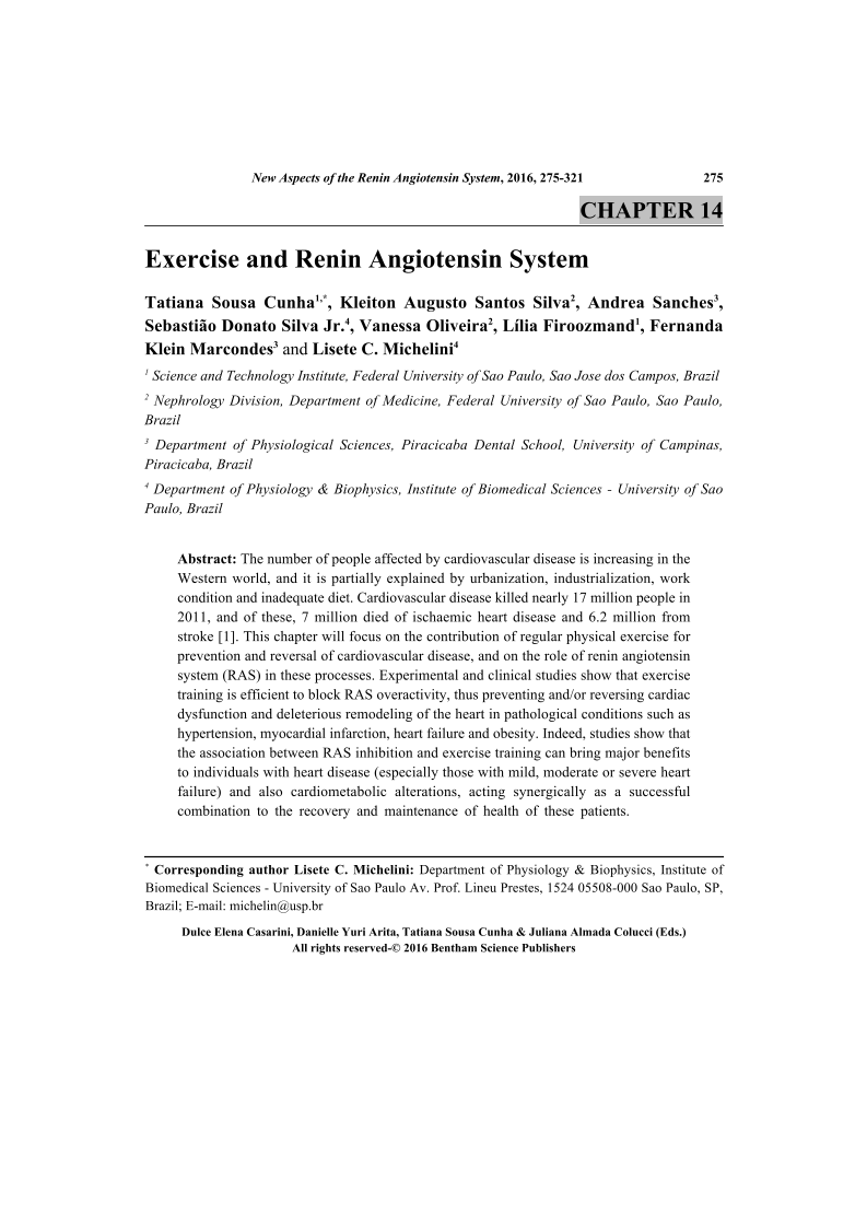 The number of people affected by cardiovascular disease is increasing in the Western world, and it is partially explained by urbanization, industrialization, work condition and inadequate diet. Cardiovascular disease killed nearly 17 million people in 2011, and of these, 7 million died of ischaemic heart disease and 6.2 million from stroke [1]. This chapter will focus on the contribution of regular physical exercise for prevention and reversal of cardiovascular disease, and on the role of renin angiotensin system (RAS) in these processes. Experimental and clinical studies show that exercise training is efficient to block RAS overactivity, thus preventing and/or reversing cardiac dysfunction and deleterious remodeling of the heart in pathological conditions such as hypertension, myocardial infarction, heart failure and obesity. Indeed, studies show that the association between RAS inhibition and exercise training can bring major benefits to individuals with heart disease (especially those with mild, moderate or severe heart failure) and also cardiometabolic alterations, acting synergically as a successful combination to the recovery and maintenance of health of these patients.