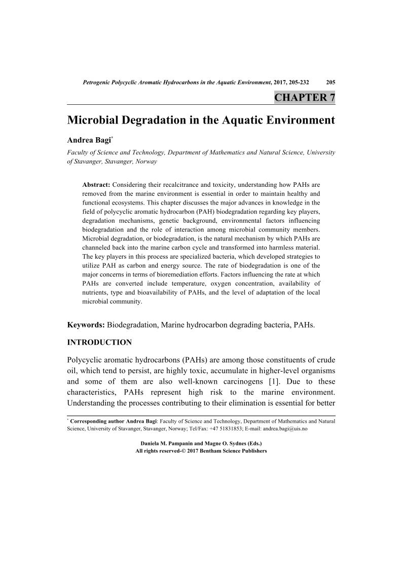 Considering their recalcitrance and toxicity, understanding how PAHs are removed from the marine environment is essential in order to maintain healthy and functional ecosystems. This chapter discusses the major advances in knowledge in the field of polycyclic aromatic hydrocarbon (PAH) biodegradation regarding key players, degradation mechanisms, genetic background, environmental factors influencing biodegradation and the role of interaction among microbial community members. Microbial degradation, or biodegradation, is the natural mechanism by which PAHs are channeled back into the marine carbon cycle and transformed into harmless material. The key players in this process are specialized bacteria, which developed strategies to utilize PAH as carbon and energy source. The rate of biodegradation is one of the major concerns in terms of bioremediation efforts. Factors influencing the rate at which PAHs are converted include temperature, oxygen concentration, availability of nutrients, type and bioavailability of PAHs, and the level of adaptation of the local microbial community.