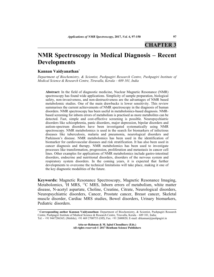 NMR Spectroscopy in Medical Diagnosis Recent Developments, Page 1 of 1