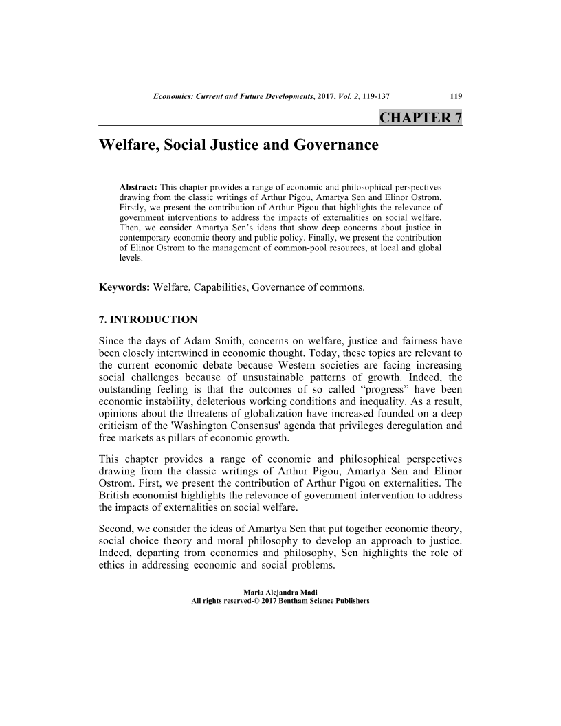 This chapter provides a range of economic and philosophical perspectives drawing from the classic writings of Arthur Pigou, Amartya Sen and Elinor Ostrom. Firstly, we present the contribution of Arthur Pigou that highlights the relevance of government interventions to address the impacts of externalities on social welfare. Then, we consider Amartya Sens ideas that show deep concerns about justice in contemporary economic theory and public policy. Finally, we present the contribution of Elinor Ostrom to the management of common-pool resources, at local and global levels.