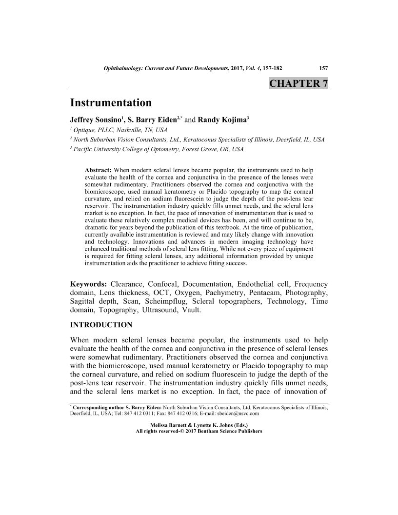 When modern scleral lenses became popular, the instruments used to help evaluate the health of the cornea and conjunctiva in the presence of the lenses were somewhat rudimentary. Practitioners observed the cornea and conjunctiva with the biomicroscope, used manual keratometry or Placido topography to map the corneal curvature, and relied on sodium fluorescein to judge the depth of the post-lens tear reservoir. The instrumentation industry quickly fills unmet needs, and the scleral lens market is no exception. In fact, the pace of innovation of instrumentation that is used to evaluate these relatively complex medical devices has been, and will continue to be, dramatic for years beyond the publication of this textbook. At the time of publication, currently available instrumentation is reviewed and may likely change with innovation and technology. Innovations and advances in modern imaging technology have enhanced traditional methods of scleral lens fitting. While not every piece of equipment is required for fitting scleral lenses, any additional information provided by unique instrumentation aids the practitioner to achieve fitting success.