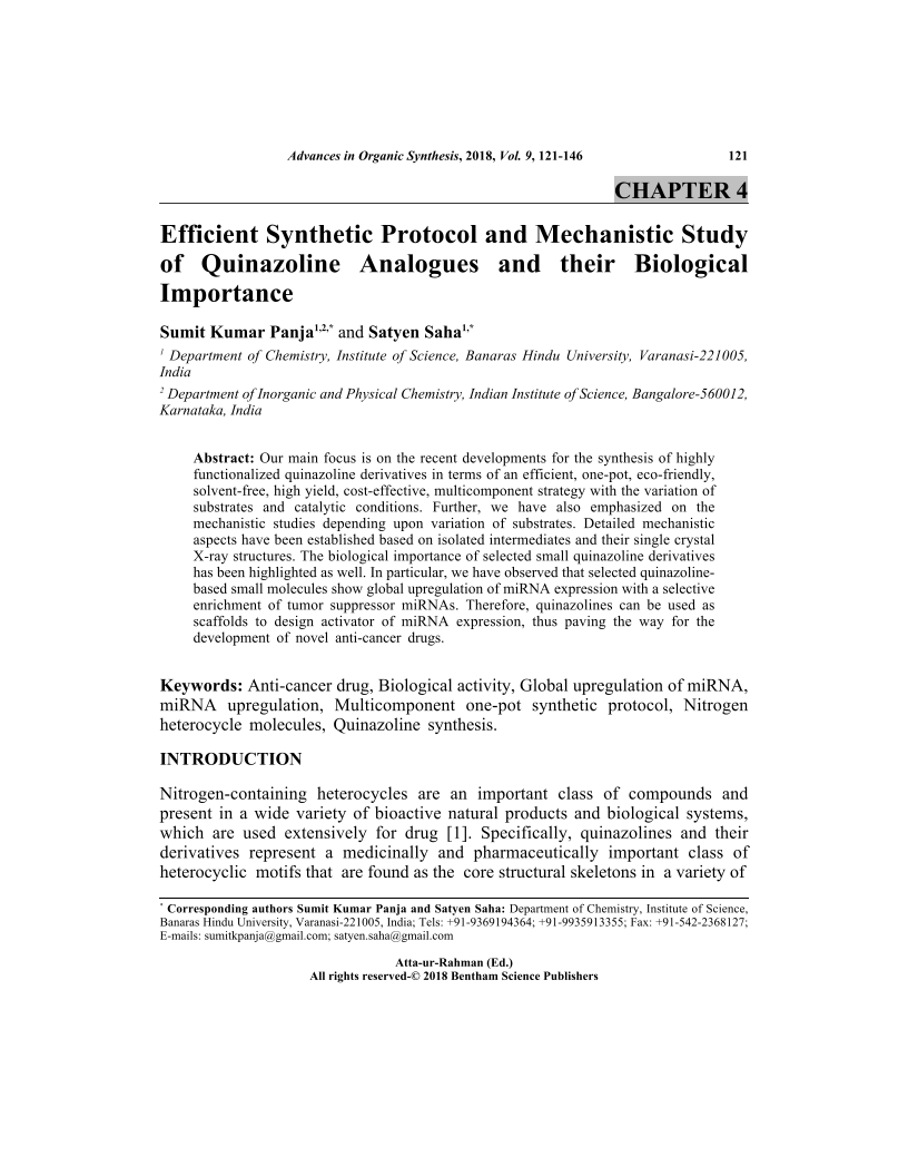 Our main focus is on the recent developments for the synthesis of highly functionalized quinazoline derivatives in terms of an efficient, one-pot, eco-friendly, solvent-free, high yield, cost-effective, multicomponent strategy with the variation of substrates and catalytic conditions. Further, we have also emphasized on the mechanistic studies depending upon variation of substrates. Detailed mechanistic aspects have been established based on isolated intermediates and their single crystal X-ray structures. The biological importance of selected small quinazoline derivatives has been highlighted as well. In particular, we have observed that selected quinazolinebased small molecules show global upregulation of miRNA expression with a selective enrichment of tumor suppressor miRNAs. Therefore, quinazolines can be used as scaffolds to design activator of miRNA expression, thus paving the way for the development of novel anti-cancer drugs.