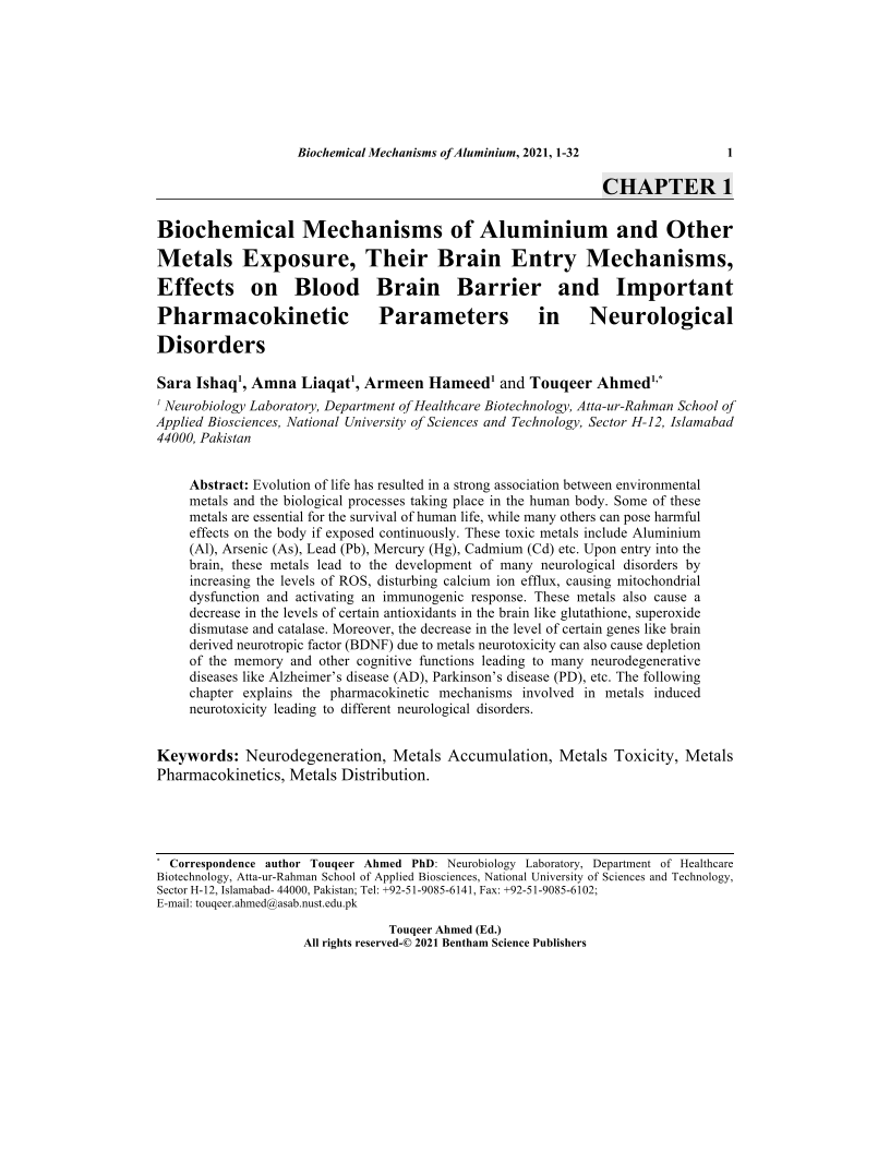 Biochemical Mechanisms of Aluminium and Other Metals Exposure, Their Brain Entry Mechanisms, Effects on Blood Brain Barrier and Important Pharmacokinetic Parameters in Neurological Disorders, Page 1 of 1
