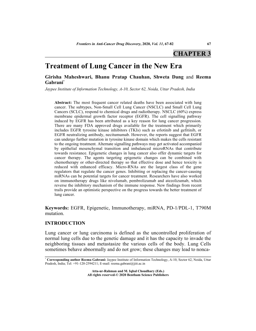 The most frequent cancer related deaths have been associated with lung cancer. The subtypes, Non-Small Cell Lung Cancer (NSCLC) and Small Cell Lung Cancers (SCLC), respond to chemical drugs and radiotherapy. NSCLC (60%) express membrane epidermal growth factor receptor (EGFR). The cell signalling pathway induced by EGFR has been attributed as a key reason for lung cancer progression. There are many FDA approved drugs available for the treatment which primarily includes EGFR tyrosine kinase inhibitors (TKIs) such as erlotinib and gefitinib, or EGFR neutralizing antibody, necitumumab. However, the reports suggest that EGFR can undergo further mutation in tyrosine kinase domain which makes the cells resistant to the ongoing treatment. Alternate signalling pathways may get activated accompanied by epithelial mesenchymal transition and imbalanced microRNAs that contribute towards resistance. Epigenetic changes in lung cancer also offer dynamic targets for cancer therapy. The agents targeting epigenetic changes can be combined with chemotherapy or other-directed therapy so that effective dose and hence toxicity is reduced with enhanced efficacy. Micro-RNAs are the largest class of the gene regulators that regulate the cancer genes. Inhibiting or replacing the cancer-causing miRNAs can be potential targets for cancer treatment. Researchers have also worked on immunotherapy drugs like nivolumab, pembrolizumab and atezolizumab, which reverse the inhibitory mechanism of the immune response. New findings from recent trails provide an optimistic perspective on the progress towards the better treatment of lung cancer.
