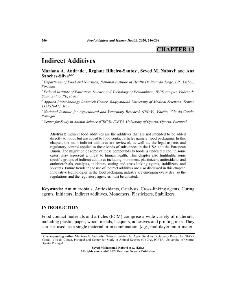 Indirect food additives are the additives that are not intended to be added directly to foods but are added to food contact articles namely, food packaging. In this chapter, the main indirect additives are reviewed, as well as, the legal aspects and regulatory control applied to these kinds of substances in the USA and the European Union. The migration of some of these compounds to foods is undesired and, in some cases, may represent a threat to human health. This chapter also highlights some specific groups of indirect additives including monomers, plasticizers, antioxidants and antimicrobials, catalysts, initiators, curing and cross-linking agents, stabilizers, and solvents. Future trends in the use of indirect additives are also discussed in this chapter. Innovative technologies in the food packaging industry are emerging every day, so the regulations and the regulatory agencies must be updated.