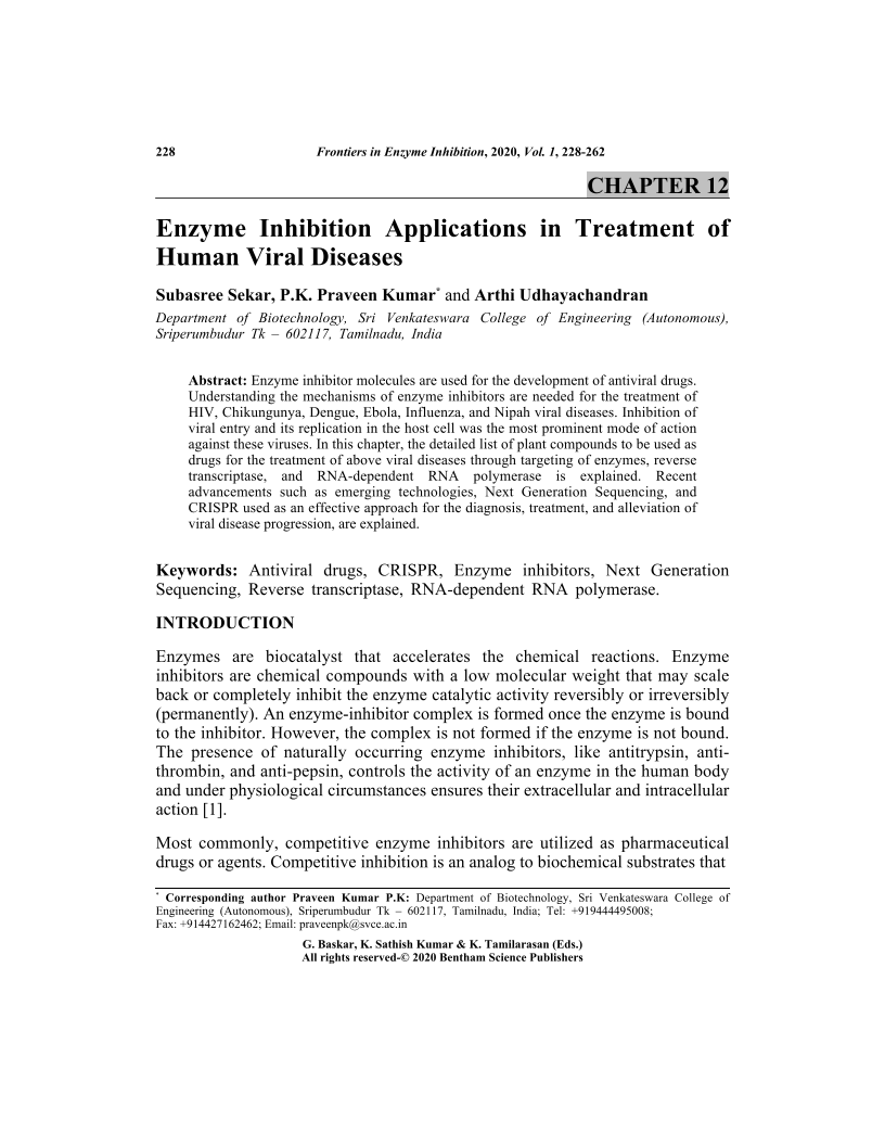 Enzyme inhibitor molecules are used for the development of antiviral drugs. Understanding the mechanisms of enzyme inhibitors are needed for the treatment of HIV, Chikungunya, Dengue, Ebola, Influenza, and Nipah viral diseases. Inhibition of viral entry and its replication in the host cell was the most prominent mode of action against these viruses. In this chapter, the detailed list of plant compounds to be used as drugs for the treatment of above viral diseases through targeting of enzymes, reverse transcriptase, and RNA-dependent RNA polymerase is explained. Recent advancements such as emerging technologies, Next Generation Sequencing, and CRISPR used as an effective approach for the diagnosis, treatment, and alleviation of viral disease progression, are explained.