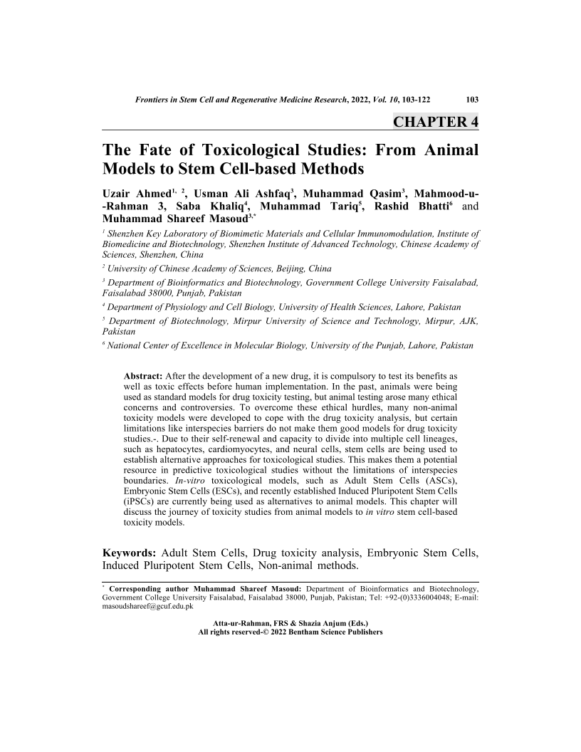 After the development of a new drug, it is compulsory to test its benefits aswell as toxic effects before human implementation. In the past, animals were beingused as standard models for drug toxicity testing, but animal testing arose many ethicalconcerns and controversies. To overcome these ethical hurdles, many non-animaltoxicity models were developed to cope with the drug toxicity analysis, but certainlimitations like interspecies barriers do not make them good models for drug toxicitystudies.-. Due to their self-renewal and capacity to divide into multiple cell lineages,such as hepatocytes, cardiomyocytes, and neural cells, stem cells are being used toestablish alternative approaches for toxicological studies. This makes them a potentialresource in predictive toxicological studies without the limitations of interspeciesboundaries. In-vitro toxicological models, such as Adult Stem Cells (ASCs),Embryonic Stem Cells (ESCs), and recently established Induced Pluripotent Stem Cells(iPSCs) are currently being used as alternatives to animal models. This chapter willdiscuss the journey of toxicity studies from animal models to in vitro stem cell-basedtoxicity models.