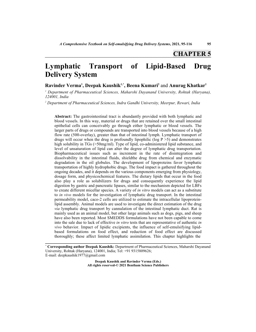 The gastrointestinal tract is abundantly provided with both lymphatic and blood vessels. In this way, material or drugs that are retained over the small intestinal epithelial cells can conceivably go through either lymphatic or blood vessels. The larger parts of drugs or compounds are transported into blood vessels because of a high flow rate (500-overlay), greater than that of intestinal lymph. Lymphatic transport of drugs will occur when the drug is profoundly lipophilic (log P >5) and demonstrates high solubility in TGs (>50mg/ml). Type of lipid, co-administered lipid substance, and level of unsaturation of lipid can alter the degree of lymphatic drug transportation. Biopharmaceutical issues such as increment in the rate of disintegration and dissolvability in the intestinal fluids, shieldthe drug from chemical and enzymatic degradation in the oil globules. The development of lipoproteins favor lymphatic transportation of highly hydrophobic drugs. The food impact is gathered throughout the ongoing decades, and it depends on the various components emerging from physiology, dosage form, and physicochemical features. The dietary lipids that occur in the food also play a role as solubilizers for drugs and consequently experience the lipid digestion by gastric and pancreatic lipases, similar to the mechanism depicted for LBFs to create different micellar species. A variety of in vitro models can act as a substitute to in vivo models for the investigation of lymphatic drug transport. In the intestinal permeability model, caco-2 cells are utilized to estimate the intracellular lipoproteinlipid assembly. Animal models are used to investigate the direct estimation of the drug via lymphatic drug transport by cannulation of the intestinal lymphatic duct. Rat is mainly used as an animal model, but other large animals such as dogs, pigs, and sheep have also been reported. Most SMEDDS formulations have not been capable to come into the sale due to lack of effective in vitro tests that are representative of authentic in vivo behavior. Impact of lipidic excipients, the influence of self-emulsifying lipidbased formulations on food effect, and reduction of food effect are discussed thoroughly; these affect limited lymphatic assimilation. This chapter highlights the various lymphatic mechanisms that help in attaining improved bioavailability, various factors, and various models used for the assessment of drug assimilation via the lymphatic system.