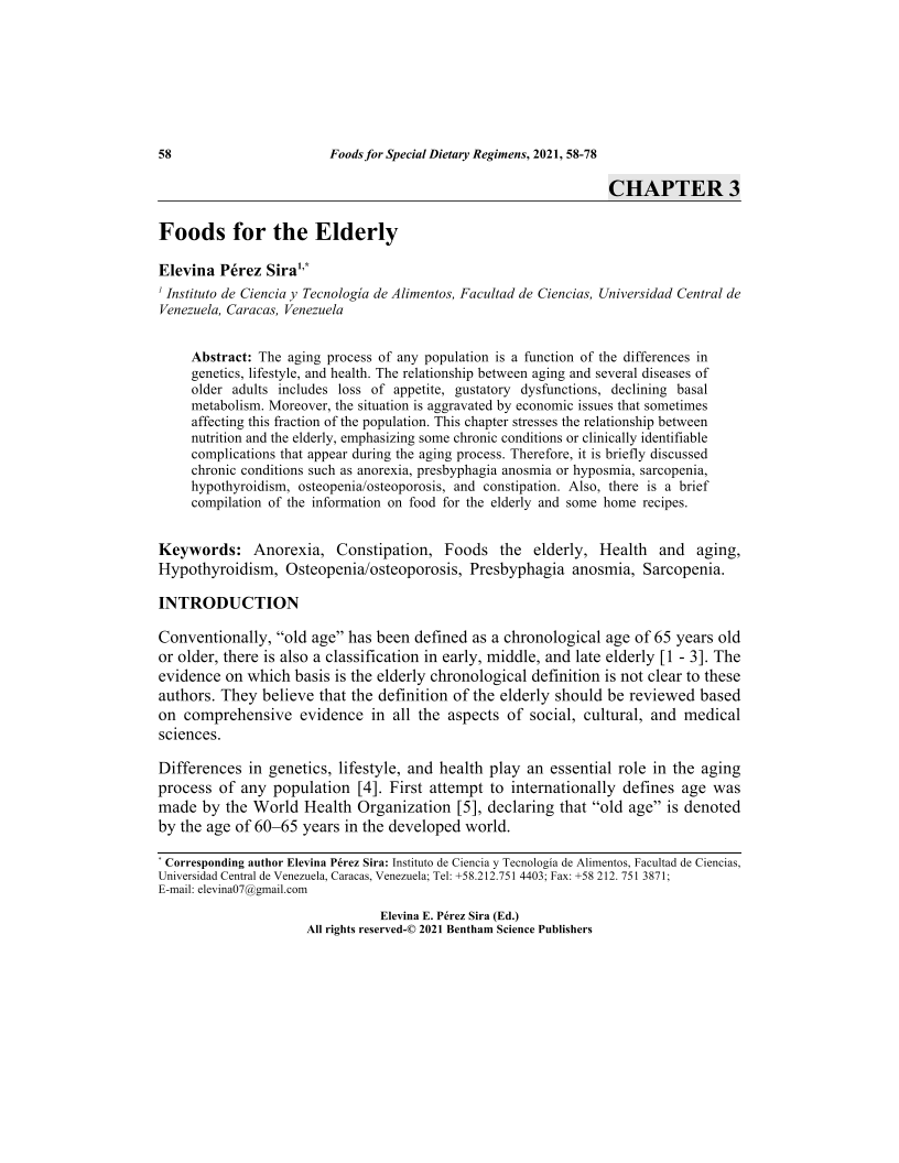 The aging process of any population is a function of the differences in genetics, lifestyle, and health. The relationship between aging and several diseases of older adults includes loss of appetite, gustatory dysfunctions, declining basal metabolism. Moreover, the situation is aggravated by economic issues that sometimes affecting this fraction of the population. This chapter stresses the relationship between nutrition and the elderly, emphasizing some chronic conditions or clinically identifiable complications that appear during the aging process. Therefore, it is briefly discussed chronic conditions such as anorexia, presbyphagia anosmia or hyposmia, sarcopenia, hypothyroidism, osteopenia/osteoporosis, and constipation. Also, there is a brief compilation of the information on food for the elderly and some home recipes.