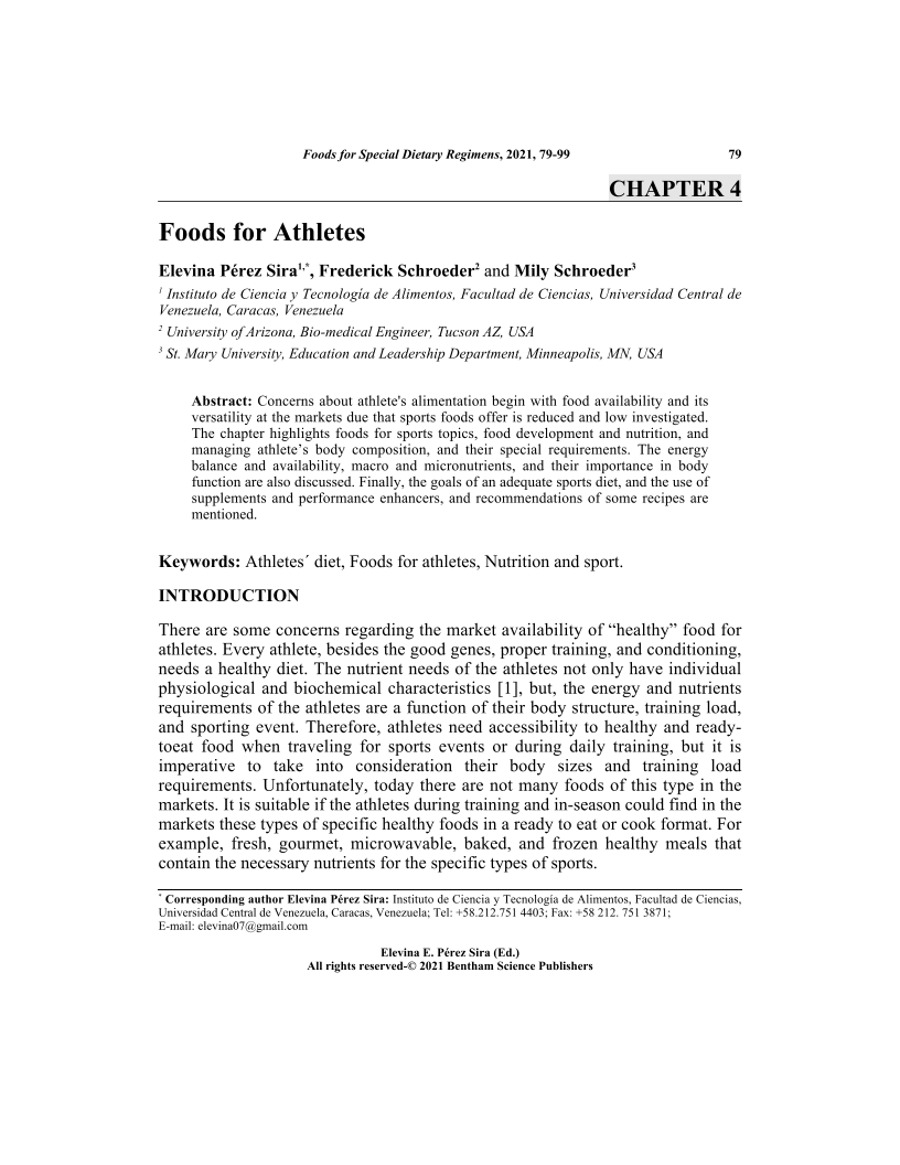Concerns about athlete's alimentation begin with food availability and its versatility at the markets due that sports foods offer is reduced and low investigated. The chapter highlights foods for sports topics, food development and nutrition, and managing athletes body composition, and their special requirements. The energy balance and availability, macro and micronutrients, and their importance in body function are also discussed. Finally, the goals of an adequate sports diet, and the use of supplements and performance enhancers, and recommendations of some recipes are mentioned.