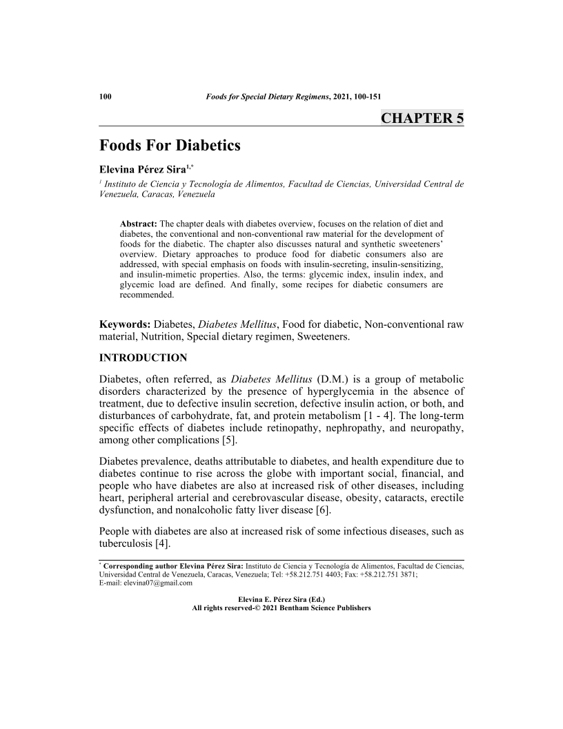 The chapter deals with diabetes overview, focuses on the relation of diet and diabetes, the conventional and non-conventional raw material for the development of foods for the diabetic. The chapter also discusses natural and synthetic sweeteners overview. Dietary approaches to produce food for diabetic consumers also are addressed, with special emphasis on foods with insulin-secreting, insulin-sensitizing, and insulin-mimetic properties. Also, the terms: glycemic index, insulin index, and glycemic load are defined. And finally, some recipes for diabetic consumers are recommended.