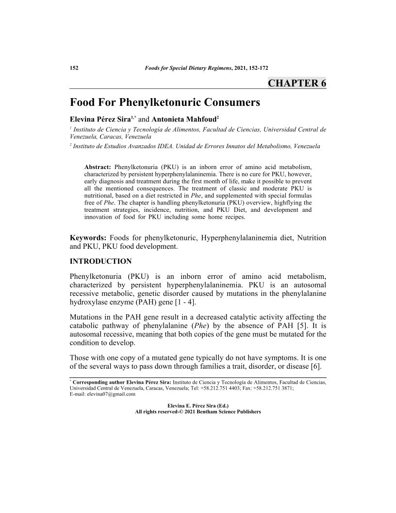 Phenylketonuria (PKU) is an inborn error of amino acid metabolism, characterized by persistent hyperphenylalaninemia. There is no cure for PKU, however, early diagnosis and treatment during the first month of life, make it possible to prevent all the mentioned consequences. The treatment of classic and moderate PKU is nutritional, based on a diet restricted in Phe, and supplemented with special formulas free of Phe. The chapter is handling phenylketonuria (PKU) overview, highflying the treatment strategies, incidence, nutrition, and PKU Diet, and development and innovation of food for PKU including some home recipes.