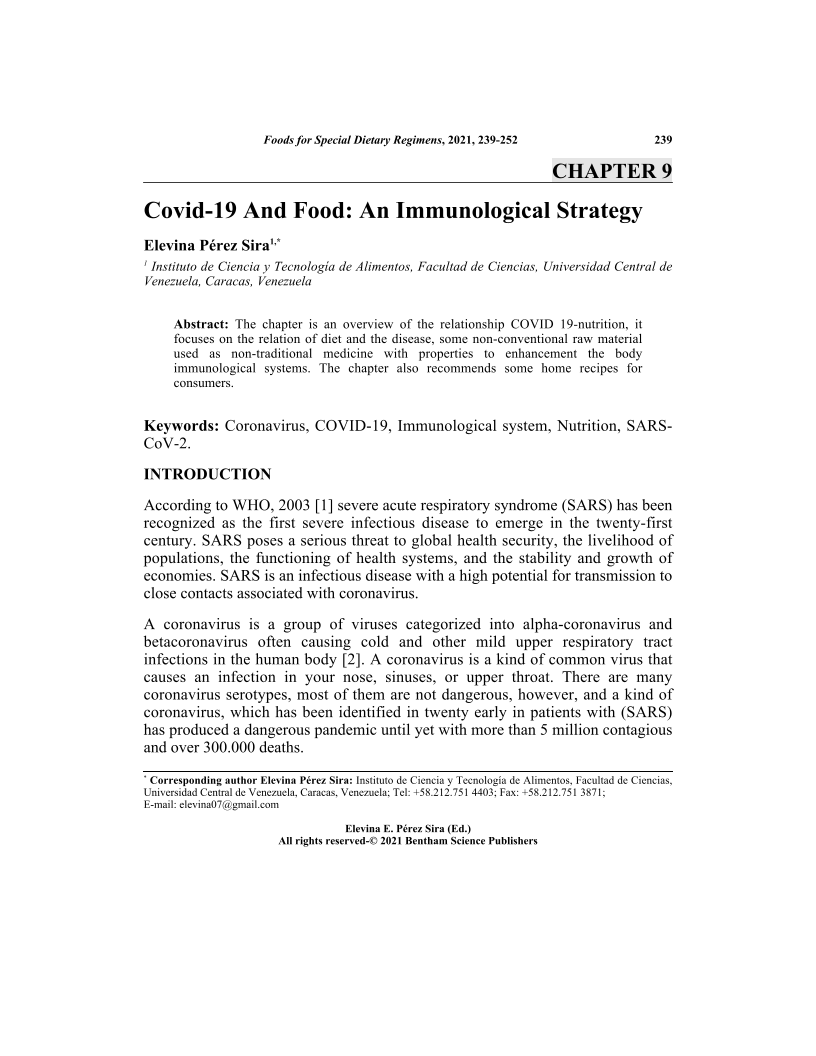 The chapter is an overview of the relationship COVID 19-nutrition, it focuses on the relation of diet and the disease, some non-conventional raw material used as non-traditional medicine with properties to enhancement the body immunological systems. The chapter also recommends some home recipes for consumers.