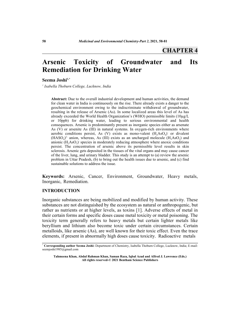 Arsenic Toxicity of Groundwater and Its Remediation for Drinking Water, Page 1 of 1