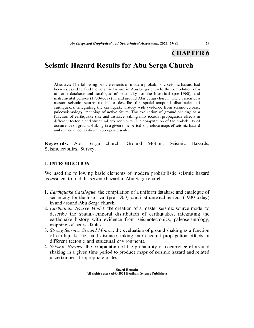 The following basic elements of modern probabilistic seismic hazard had been assessed to find the seismic hazard in Abu Serga church; the compilation of a uniform database and catalogue of seismicity for the historical (pre-1900), and instrumental periods (1900-today) in and around Abu Serga church. The creation of a master seismic source model to describe the spatial-temporal distribution of earthquakes, integrating the earthquake history with evidence from seismotectonic, paleoseismology, mapping of active faults. The evaluation of ground shaking as a function of earthquake size and distance, taking into account propagation effects in different tectonic and structural environments. The computation of the probability of occurrence of ground shaking in a given time period to produce maps of seismic hazard and related uncertainties at appropriate scales.