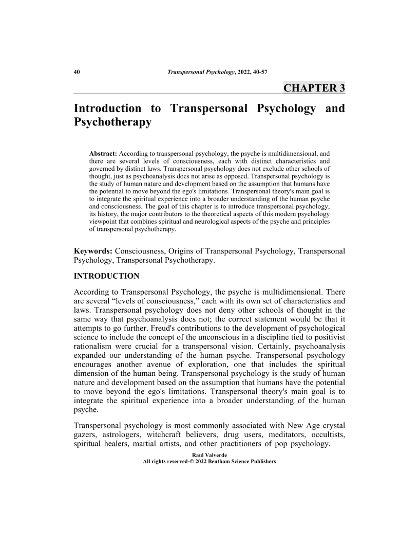 According to transpersonal psychology, the psyche is multidimensional, andthere are several levels of consciousness, each with distinct characteristics andgoverned by distinct laws. Transpersonal psychology does not exclude other schools ofthought, just as psychoanalysis does not arise as opposed. Transpersonal psychology isthe study of human nature and development based on the assumption that humans havethe potential to move beyond the ego's limitations. Transpersonal theory's main goal isto integrate the spiritual experience into a broader understanding of the human psycheand consciousness. The goal of this chapter is to introduce transpersonal psychology,its history, the major contributors to the theoretical aspects of this modern psychologyviewpoint that combines spiritual and neurological aspects of the psyche and principlesof transpersonal psychotherapy.