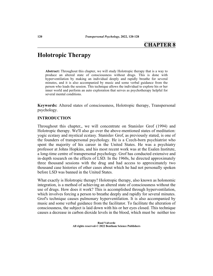 Throughout this chapter, we will study Holotropic therapy that is a way toproduce an altered state of consciousness without drugs. This is done withhyperventilation by making an individual deeply and rapidly breathe for severalminutes, and it is also accompanied by music and some verbal guidance from theperson who leads the session. This technique allows the individual to explore his or herinner world and perform an auto exploration that serves as psychotherapy helpful forseveral mental conditions.