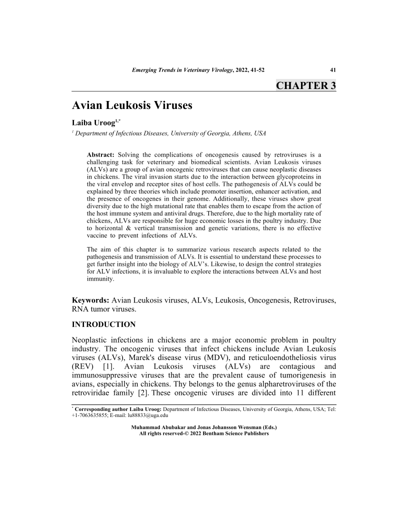 Solving the complications of oncogenesis caused by retroviruses is achallenging task for veterinary and biomedical scientists. Avian Leukosis viruses(ALVs) are a group of avian oncogenic retroviruses that can cause neoplastic diseasesin chickens. The viral invasion starts due to the interaction between glycoproteins inthe viral envelop and receptor sites of host cells. The pathogenesis of ALVs could beexplained by three theories which include promoter insertion, enhancer activation, andthe presence of oncogenes in their genome. Additionally, these viruses show greatdiversity due to the high mutational rate that enables them to escape from the action ofthe host immune system and antiviral drugs. Therefore, due to the high mortality rate ofchickens, ALVs are responsible for huge economic losses in the poultry industry. Dueto horizontal & vertical transmission and genetic variations, there is no effectivevaccine to prevent infections of ALVs.The aim of this chapter is to summarize various research aspects related to thepathogenesis and transmission of ALVs. It is essential to understand these processes toget further insight into the biology of ALV's. Likewise, to design the control strategiesfor ALV infections, it is invaluable to explore the interactions between ALVs and hostimmunity.