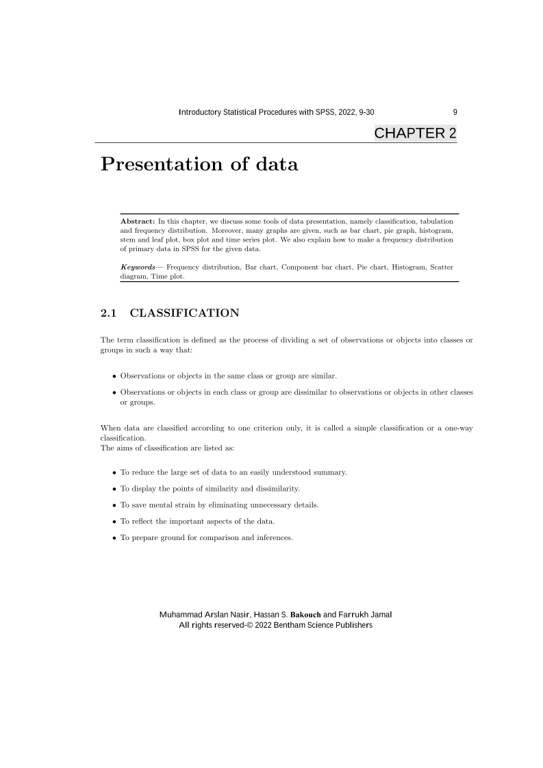 In this chapter, we discuss some tools of data presentation, namely classification, tabulation and frequency distribution. Moreover, many graphs are given, such as bar chart, pie graph, histogram, stem and leaf plot, box plot and time series plot. We also explain how to make a frequency distribution of primary data in SPSS for the given data.<br>