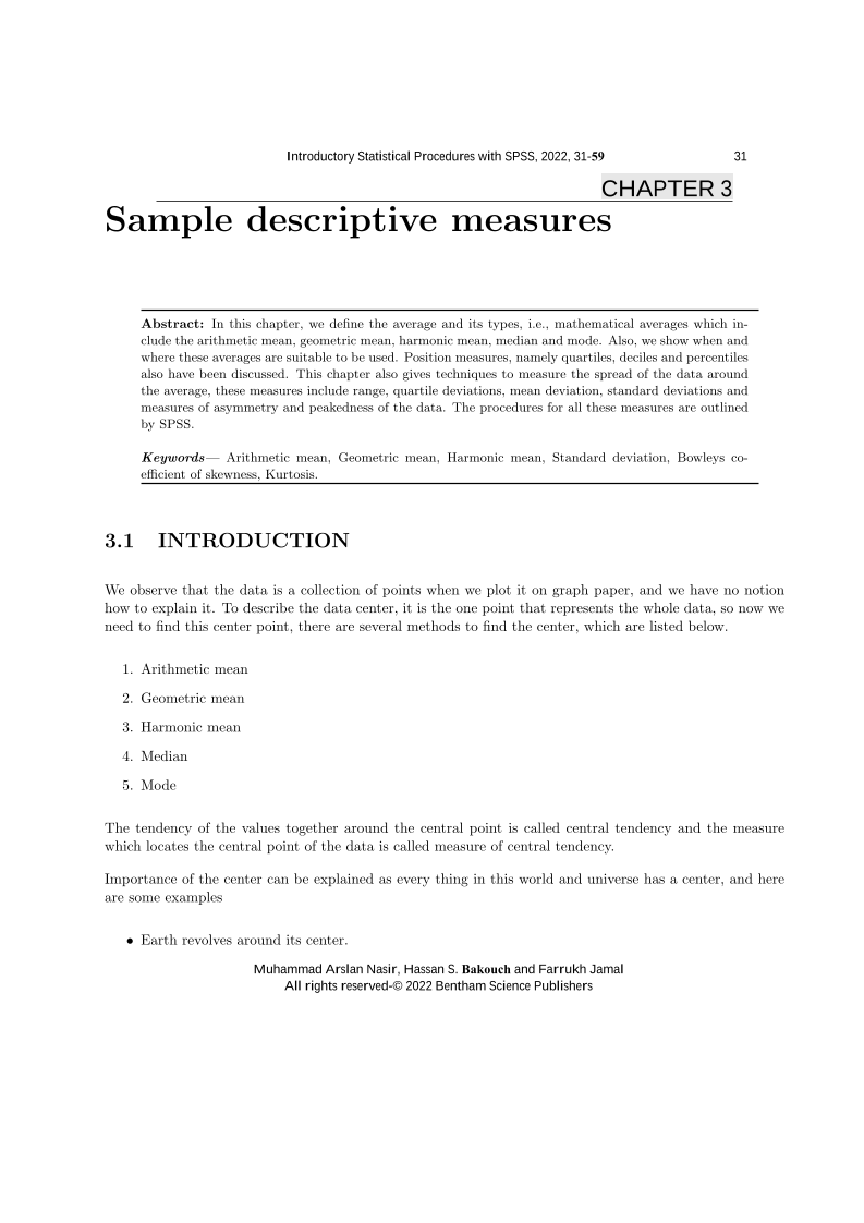 In this chapter, we define the average and its types, i.e., mathematical averages which include the arithmetic mean, geometric mean, harmonic mean, median and mode. Also, we show when and where these averages are suitable to be used. Position measures, namely quartiles, deciles and percentiles also have been discussed. This chapter also gives techniques to measure the spread of the data around the average, these measures include range, quartile deviations, mean deviation, standard deviations and measures of asymmetry and peakedness of the data. The procedures for all these measures are outlined by SPSS.<br>