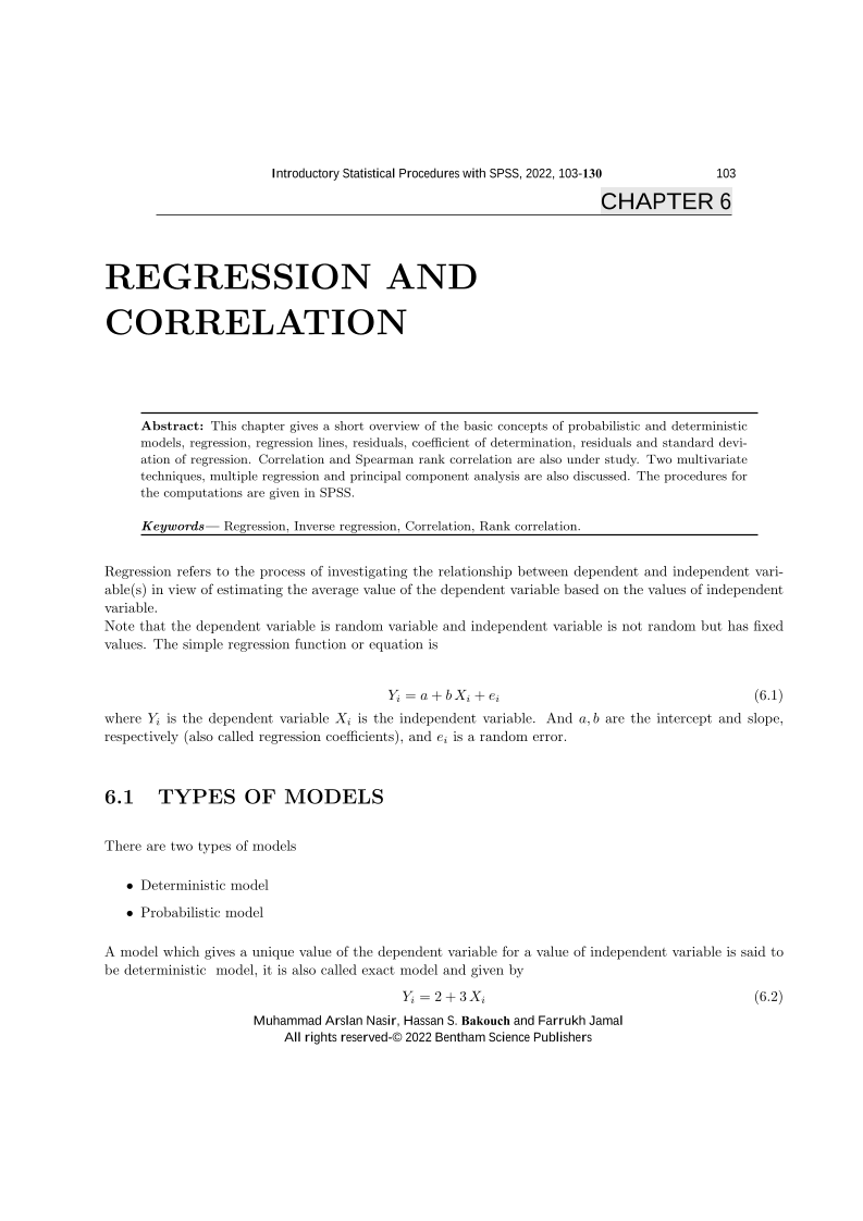 This chapter gives a short overview of the basic concepts of probabilistic and deterministic models, regression, regression lines, residuals, coefficient of determination, residuals and standard devi ation of regression. Correlation and Spearman rank correlation are also under study. Two multivariate techniques, multiple regression and principal component analysis are also discussed. The procedures for the computations are given in SPSS<br>