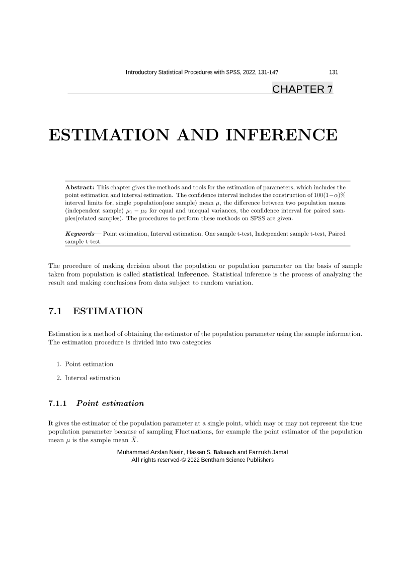 This chapter gives the methods and tools for the estimation of parameters, which includes the point estimation and interval estimation. The confidence interval includes the construction of 100(1−α)% interval limits for, single population(one sample) mean µ, the difference between two population means (independent sample) µ1 − µ2 for equal and unequal variances, the confidence interval for paired samples(related samples). The procedures to perform these methods on SPSS are given.<br>