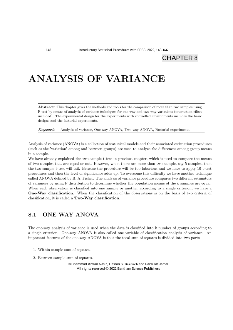 This chapter gives the methods and tools for the comparison of more than two samples using F-test by means of analysis of variance techniques for one-way and two-way variations (interaction effect included). The experimental design for the experiments with controlled environments includes the basic designs and the factorial experiments.<br>