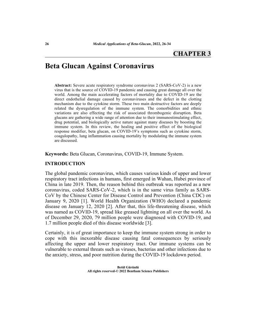 <div>Severe acute respiratory syndrome coronavirus 2 (SARS-CoV-2) is a new</div><div>virus that is the source of COVID-19 pandemic and causing great damage all over the</div><div>world. Among the main accelerating factors of mortality due to COVID-19 are the</div><div>direct endothelial damage caused by coronaviruses and the defect in the clotting</div><div>mechanism due to the cytokine storm. These two main destructive factors are deeply</div><div>related the dysregulation of the immune system. The comorbidities and ethnic</div><div>variations are also effecting the risk of associated thrombogenic disruption. Beta</div><div>glucans are gathering a wide range of attention due to their immunostimulating effect,</div><div>drug potential, and biologically active nature against many diseases by boosting the</div><div>immune system. In this review, the healing and positive effect of the biological</div><div>response modifier, beta glucan, on COVID-19's symptoms such as cytokine storm,</div><div>coagulopathy, lung inflammation causing mortality by modulating the immune system</div><div>are discussed.</div>