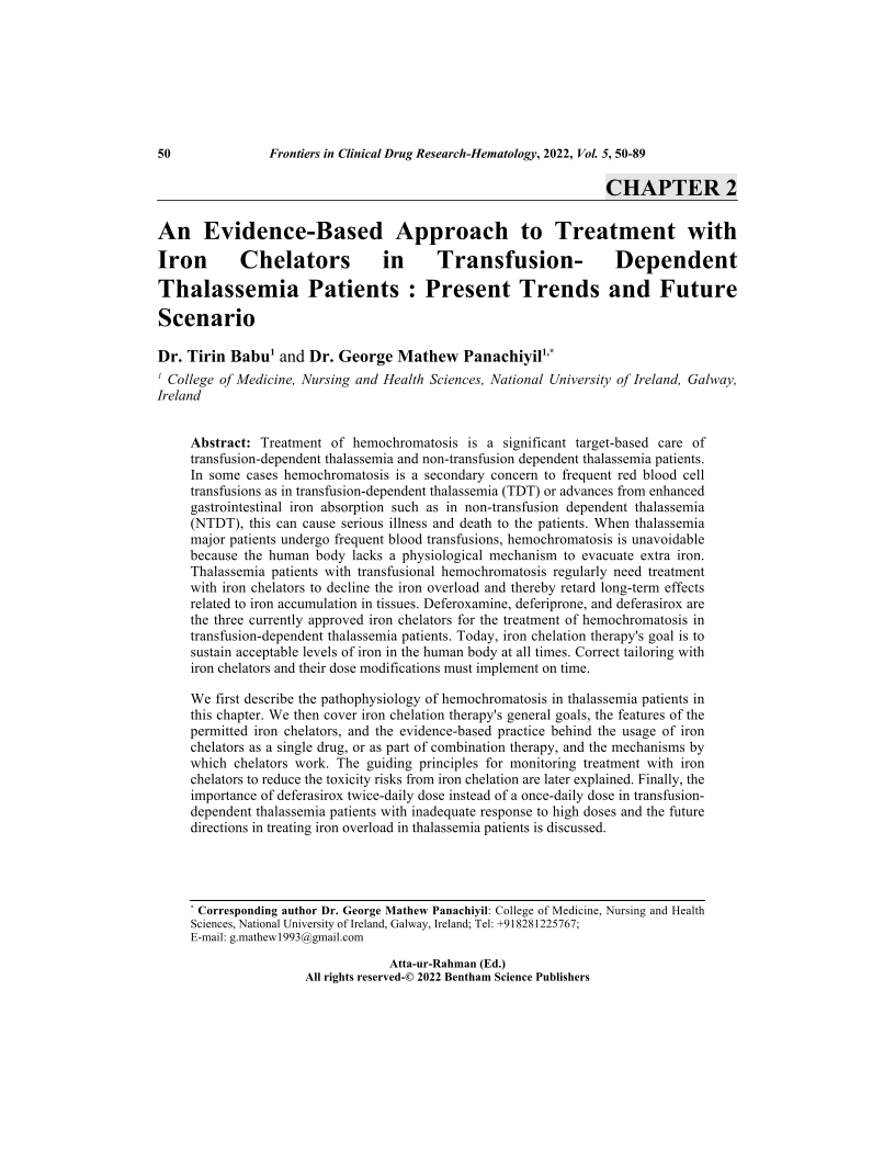 Treatment of hemochromatosis is a significant target-based care oftransfusion-dependent thalassemia and non-transfusion dependent thalassemia patients.In some cases hemochromatosis is a secondary concern to frequent red blood celltransfusions as in transfusion-dependent thalassemia (TDT) or advances from enhancedgastrointestinal iron absorption such as in non-transfusion dependent thalassemia(NTDT), this can cause serious illness and death to the patients. When thalassemiamajor patients undergo frequent blood transfusions, hemochromatosis is unavoidablebecause the human body lacks a physiological mechanism to evacuate extra iron.Thalassemia patients with transfusional hemochromatosis regularly need treatmentwith iron chelators to decline the iron overload and thereby retard long-term effectsrelated to iron accumulation in tissues. Deferoxamine, deferiprone, and deferasirox arethe three currently approved iron chelators for the treatment of hemochromatosis intransfusion-dependent thalassemia patients. Today, iron chelation therapy's goal is tosustain acceptable levels of iron in the human body at all times. Correct tailoring withiron chelators and their dose modifications must implement on time.We first describe the pathophysiology of hemochromatosis in thalassemia patients inthis chapter. We then cover iron chelation therapy's general goals, the features of thepermitted iron chelators, and the evidence-based practice behind the usage of ironchelators as a single drug, or as part of combination therapy, and the mechanisms bywhich chelators work. The guiding principles for monitoring treatment with ironchelators to reduce the toxicity risks from iron chelation are later explained. Finally, theimportance of deferasirox twice-daily dose instead of a once-daily dose in transfusiondependentthalassemia patients with inadequate response to high doses and the futuredirections in treating iron overload in thalassemia patients is discussed.
