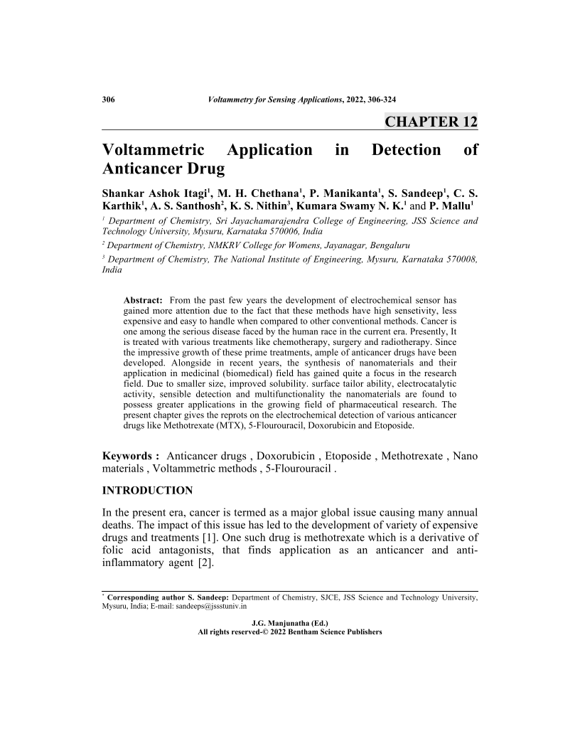 From the past few years the development of electrochemical sensor hasgained more attention due to the fact that these methods have high sensetivity, lessexpensive and easy to handle when compared to other conventional methods. Cancer isone among the serious disease faced by the human race in the current era. Presently, Itis treated with various treatments like chemotherapy, surgery and radiotherapy. Sincethe impressive growth of these prime treatments, ample of anticancer drugs have beendeveloped. Alongside in recent years, the synthesis of nanomaterials and theirapplication in medicinal (biomedical) field has gained quite a focus in the researchfield. Due to smaller size, improved solubility. surface tailor ability, electrocatalyticactivity, sensible detection and multifunctionality the nanomaterials are found topossess greater applications in the growing field of pharmaceutical research. Thepresent chapter gives the reprots on the electrochemical detection of various anticancerdrugs like Methotrexate (MTX), 5-Flourouracil, Doxorubicin and Etoposide.