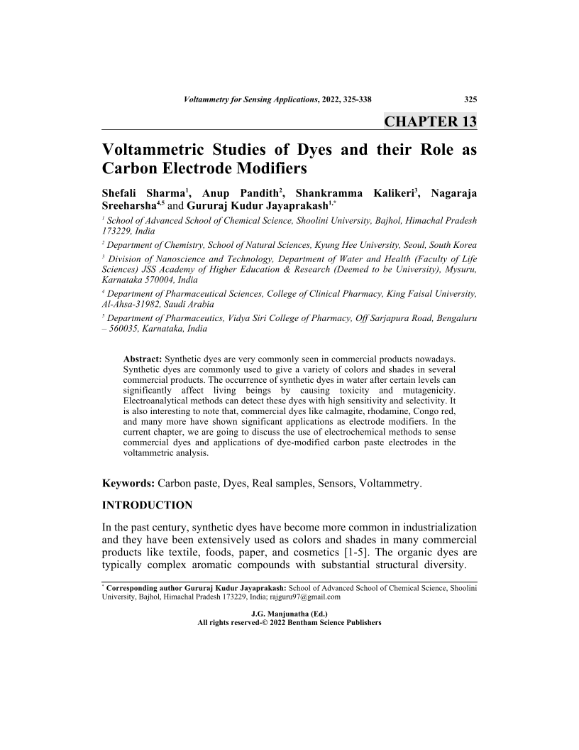 Synthetic dyes are very commonly seen in commercial products nowadays.Synthetic dyes are commonly used to give a variety of colors and shades in severalcommercial products. The occurrence of synthetic dyes in water after certain levels cansignificantly affect living beings by causing toxicity and mutagenicity.Electroanalytical methods can detect these dyes with high sensitivity and selectivity. Itis also interesting to note that, commercial dyes like calmagite, rhodamine, Congo red,and many more have shown significant applications as electrode modifiers. In thecurrent chapter, we are going to discuss the use of electrochemical methods to sensecommercial dyes and applications of dye-modified carbon paste electrodes in thevoltammetric analysis.