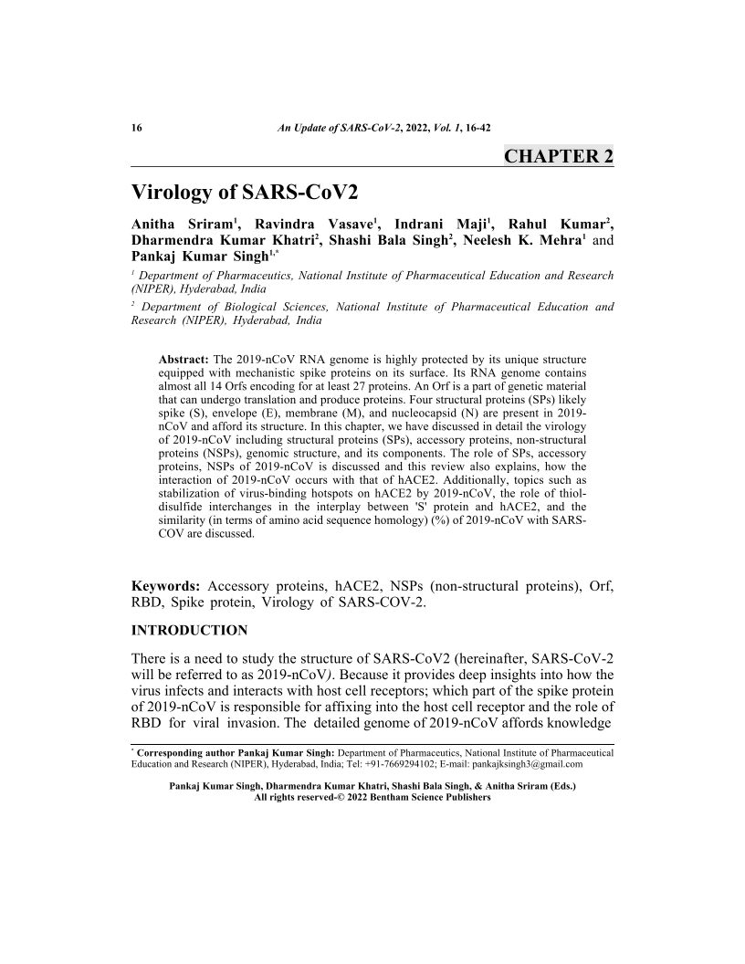 The 2019-nCoV RNA genome is highly protected by its unique structure equipped with mechanistic spike proteins on its surface. Its RNA genome contains almost all 14 Orfs encoding for at least 27 proteins. An Orf is a part of genetic material that can undergo translation and produce proteins. Four structural proteins (SPs) likely spike (S), envelope (E), membrane (M), and nucleocapsid (N) are present in 2019- nCoV and afford its structure. In this chapter, we have discussed in detail the virology of 2019-nCoV including structural proteins (SPs), accessory proteins, non-structural proteins (NSPs), genomic structure, and its components. The role of SPs, accessory proteins, NSPs of 2019-nCoV is discussed and this review also explains, how the interaction of 2019-nCoV occurs with that of hACE2. Additionally, topics such as stabilization of virus-binding hotspots on hACE2 by 2019-nCoV, the role of thiol disulfide interchanges in the interplay between 'S' protein and hACE2, and the similarity (in terms of amino acid sequence homology) (%) of 2019-nCoV with SARS COV are discussed. nbsp;